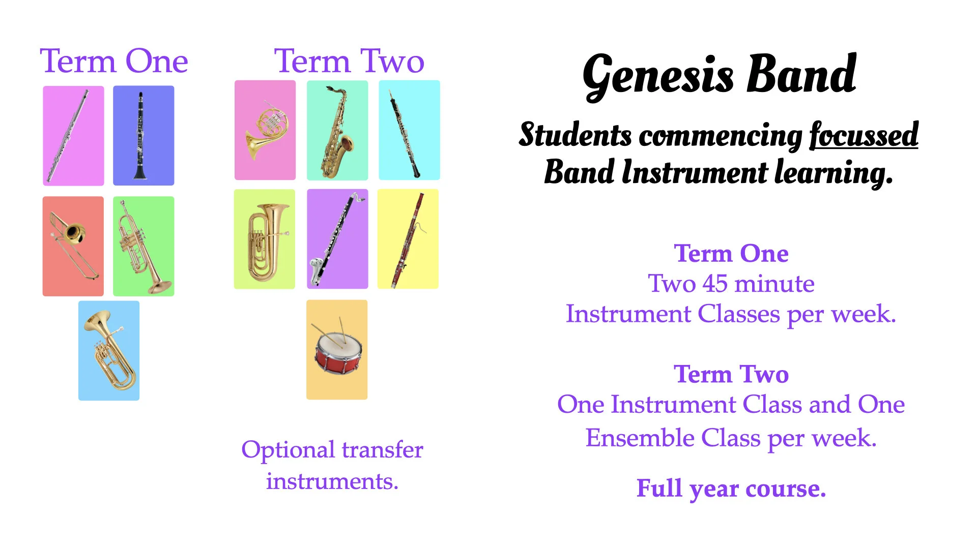 Genesis Band students commence instruction on one of the following five Band instruments; Flute, Clarinet, Trumpet, Trombone or Euphonium. In second term students may transition to other instruments including Saxophone, Bass Clarinet, Tuba and Percussion.